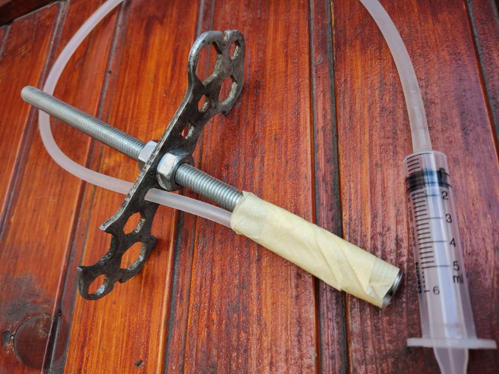 U mladjim danima uspesno sam servisirao marcocchi (pre kineza) i rockshox na svojim biciklama pa sto ne bi mogao i showu koja pritom nema podesavanja koja su imale napredne vile za bajs u to vreme Zamenjeno ulje, semerinzi i prasinari, premerene opruge i pregledani svi delovi. Teflon klizaci su kao novi, sve mere su u tolerancijama. Posebno sam ponosan na alat od nasumicnih predmeta po garazi, sluzi za precizno odmeravanje nivoa ulja u stapu, i u mm je precizan: Ali dizanje jedne pristojne radionice za sopstvene potrebe je definitivno sledeci projekat.