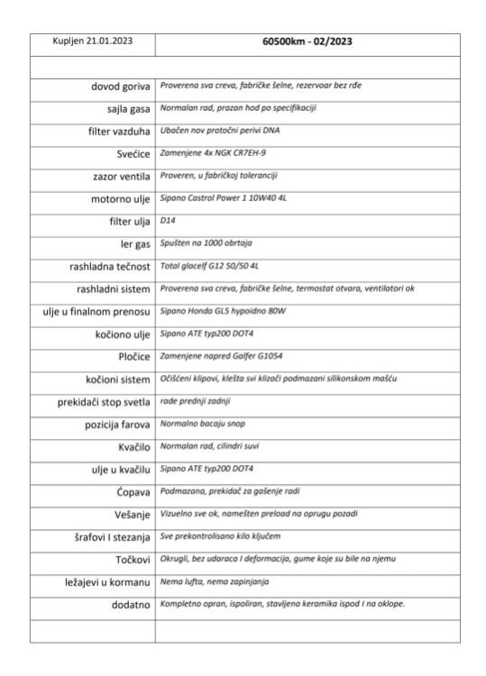 Hvala svima, samo da me posluzi dobra organizacija vremena Poceo pomalo da srafim, sve tecnosti, plocice, svecice, filteri i potrosno spremno i polako jedno po jedno. Masina je presla 60k sto je za panevropu smejurija, sve ukazuje da je to prava km, svuda je suv, nije diran, samo prljav. Tako da sam agregat necu cackati osim provere zazora ventila. Plan je revizija vesanja kad pocnem da ga vozim, u ovoj fazi jedino resio hidraulicni preload zadnjeg amorta koji nije radio.