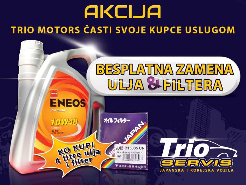 AKCIJA BESPLATNE ZAMENE ULJA I FILTERA Kompanija TRIO Motors poklanja svim svojim kupcima besplatnu zamenu ulja i filtera. Pravo na poklon ostvarujete kupovinom 4L ENEOS ulja sa pripadajućim filterom u prodavnici TRIO motors ili u TRIO servisu. Pri kupovini dobijate kupon koji će vam izdati naša služba prodaje uz fiskalni račun. Predajom kupona u servisu, stekli ste pravo na besplatno ostvarivanje usluge. AKCIJA zamene traje do kraja godine! Vaš TRIO motors i TRIO servis