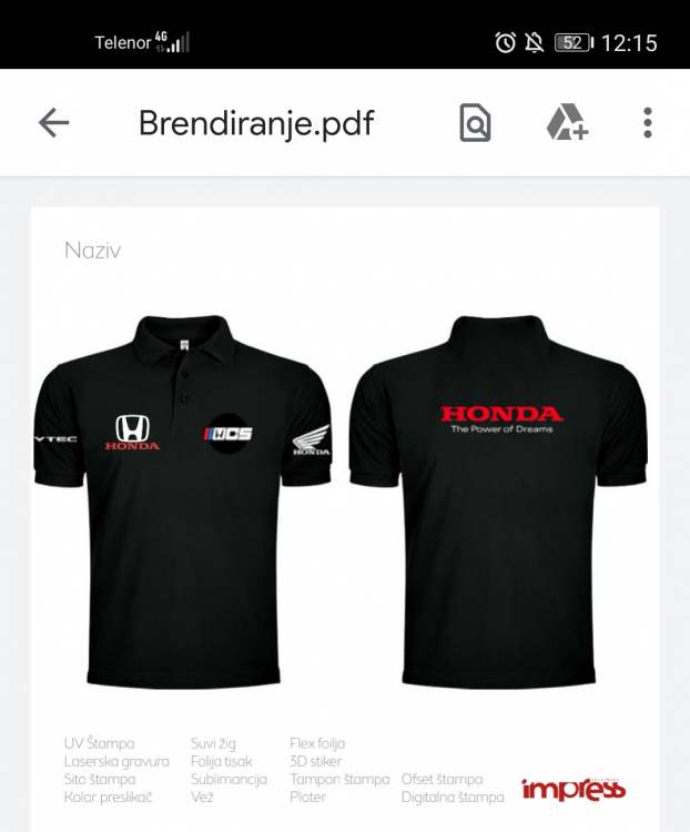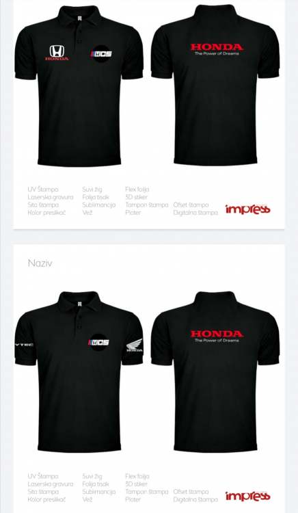 zex_76 Posted June 25, 2020 Report Posted June 25, 2020 Ја сам за прву комб. са малим изменама.1. Без оног мото знака на левом рукаву2. На том истом месту може да иде лого HCS, а може и да остане где јесте, а лева страна рукава да остане празна.3. Црвени (Н) лого на грудима4. На леђима додатни (H) лого испод врата.5. Ваљало би испод лого HCS ситним словима да пише пун назив Honda club Serbia.Око одабира боја мајица би се накнадно договорили, може она navy bluе, тамнија сива ( gunmetal) само да не буде светло сива, само мој предлог. Quote
